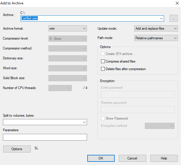 In meinem Fall (OS = Windows Server) half 7zip. Wenn man den certbot Ordner auf der alten Hardware einpackt, benutzt man als Archiv Typ <wim>.